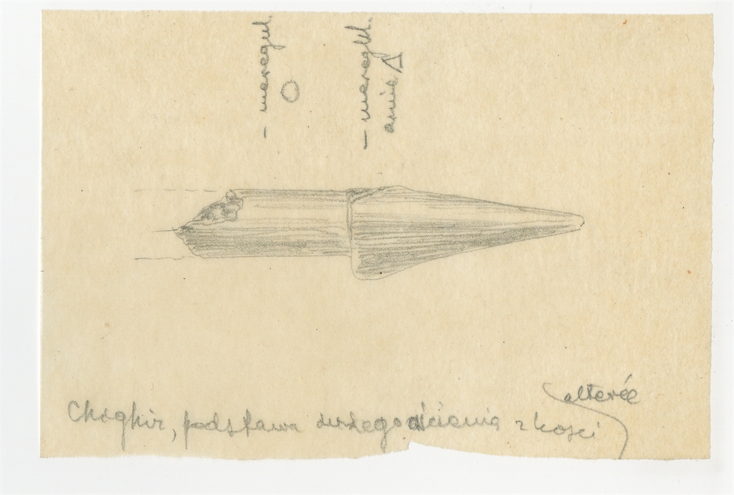 Rysunek zabytku kościanego ze stanowiska Szigir (Chighiz) na Uralu - zbiór Barona de Baye z końca XIX w. Ołówek na kalce