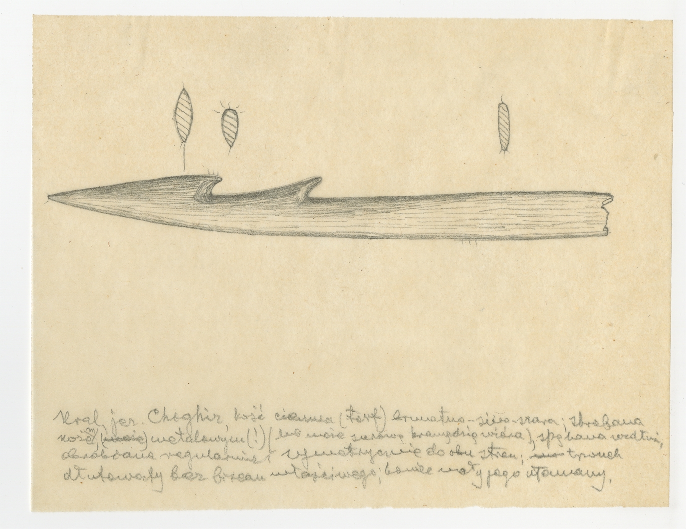 Rysunek zabytku kościanego ze stanowiska Szigir (Chighiz) na Uralu - zbiór Barona de Baye z końca XIX w. Ołówek na kalce