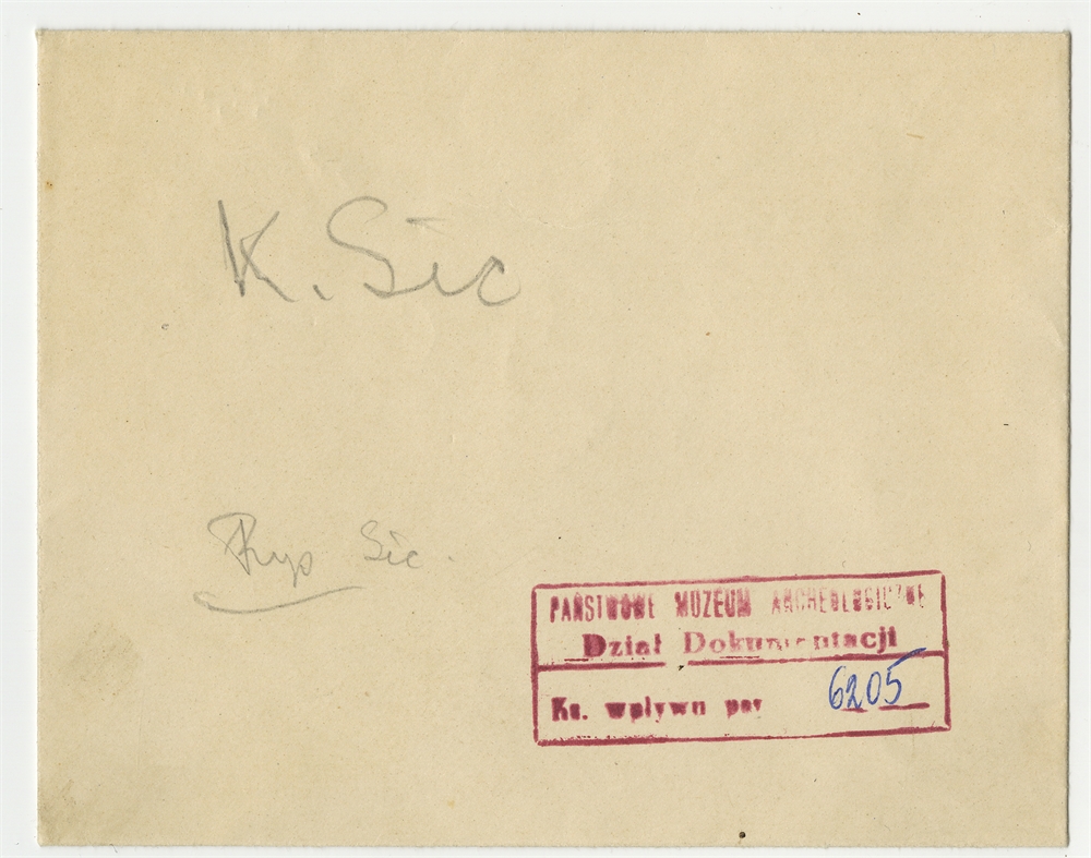 Rysunek zabytku krzemiennego (1 szt.) wykonany przez K. Sicińskiego przechowywany w kopercie opisanej ręką NN "K. Sic / Rys Sic" - awers koperty z podpisem