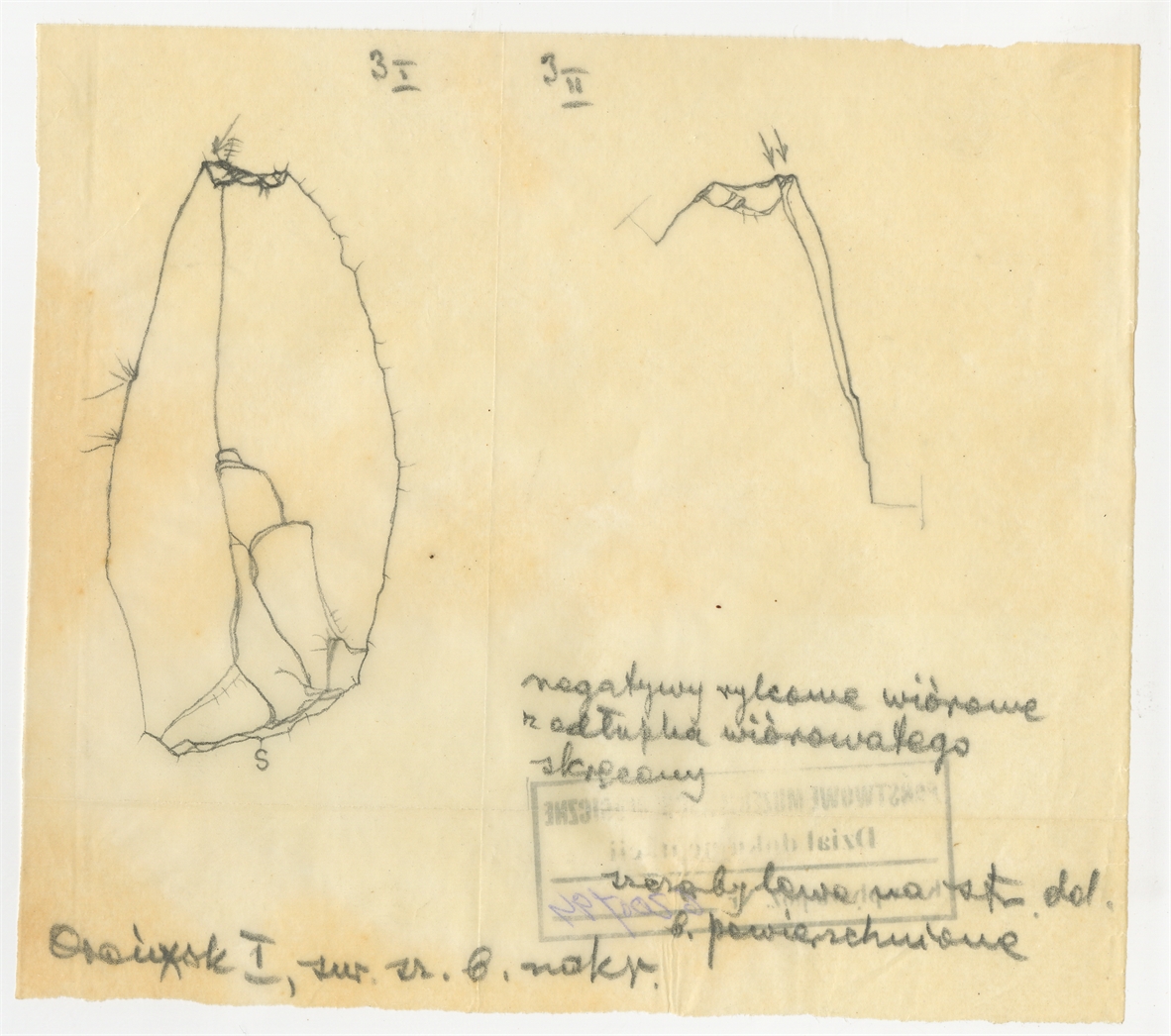 Rysunek zabytku krzemiennego. Ołówek na kalce. "Orońsk I"