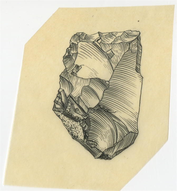 Rysunek zabytku krzemiennego w 1 rzucie. Tusz na kalce