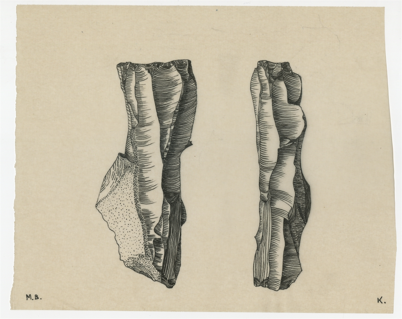 Rysunek zabytku krzemiennego w 2 rzutach. Tusz na kalce