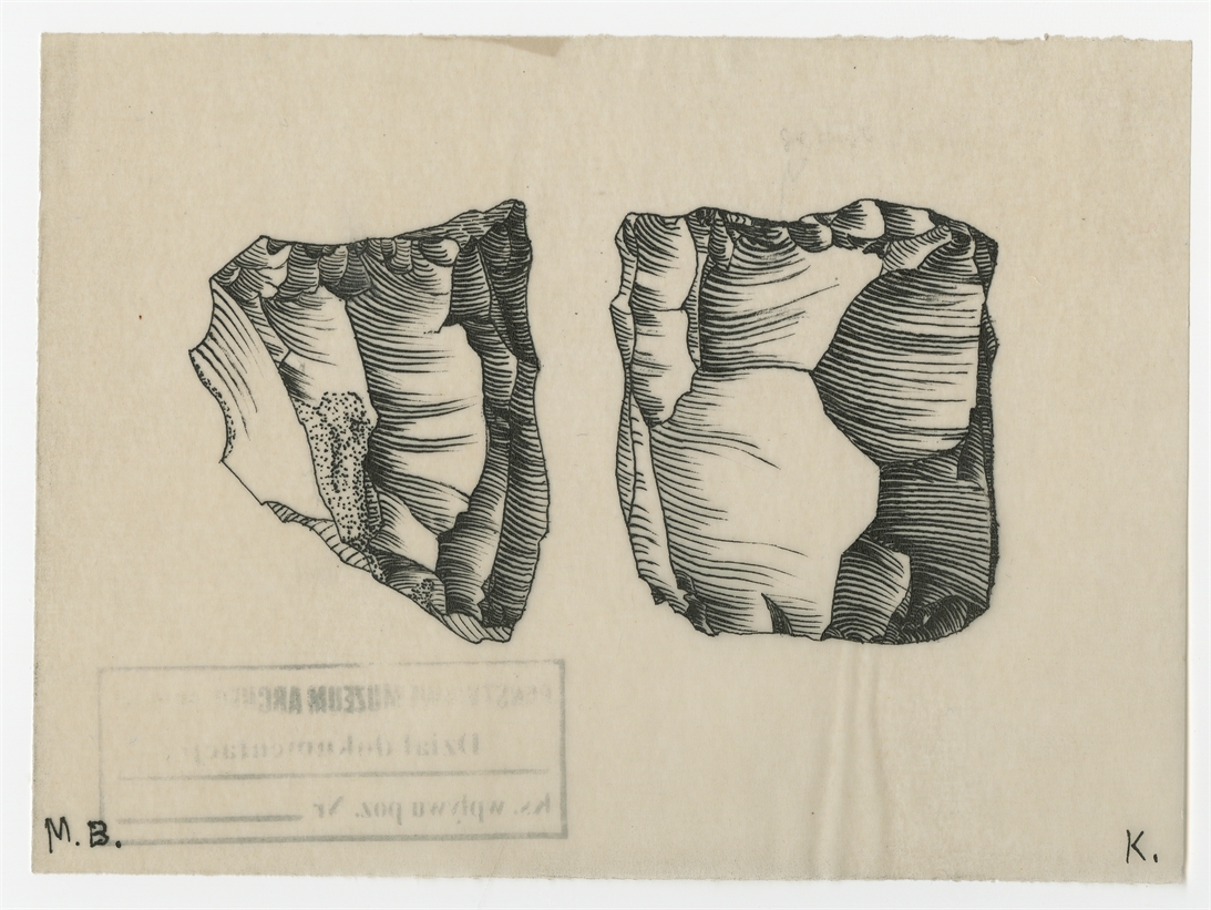 Rysunek zabytku krzemiennego w 2 rzutach. Tusz na kalce