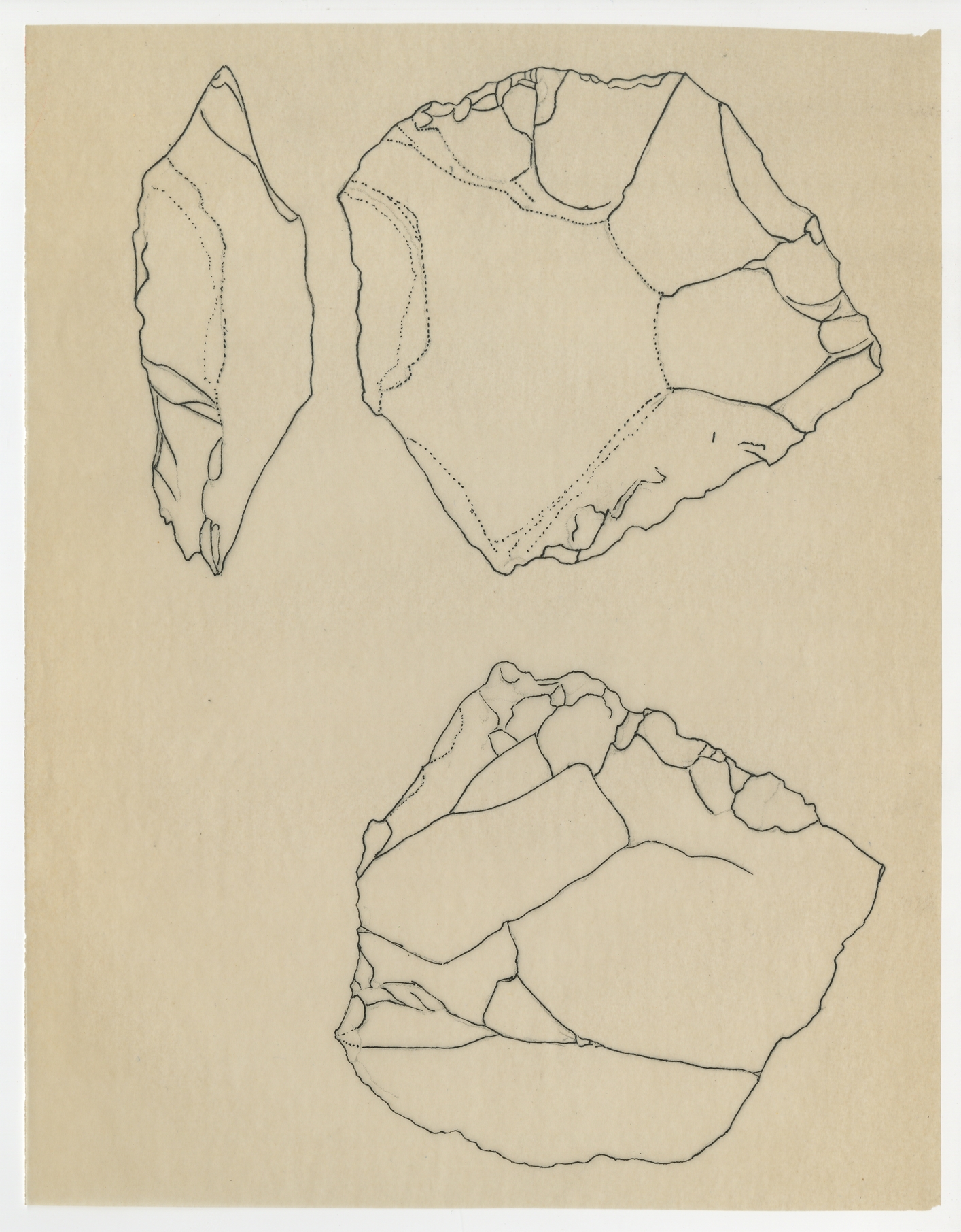 Rysunek zabytku krzemiennego w 3 rzutach. Tusz na kalce
