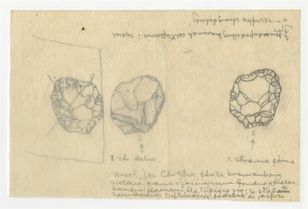 Rysunek zabytku krzemiennego ze stanowiska Szigir (Chighiz) na Uralu - zbiór Barona de Baye z końca XIX w. Ołówek na kalce