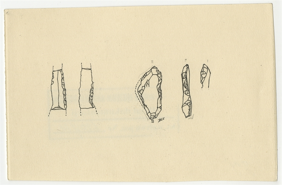 Rysunki konturowe zabytków krzemiennych ze stanowiska Gaj. Tusz na kartonie.