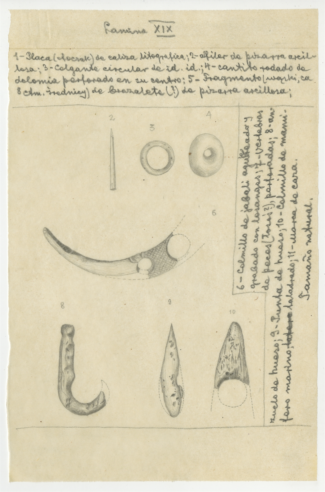 Rysunki - kopie zabytków kościanych i krzemiennych z publikacji Miguela Such'a "Hayo de la Mina". Tablica XIX