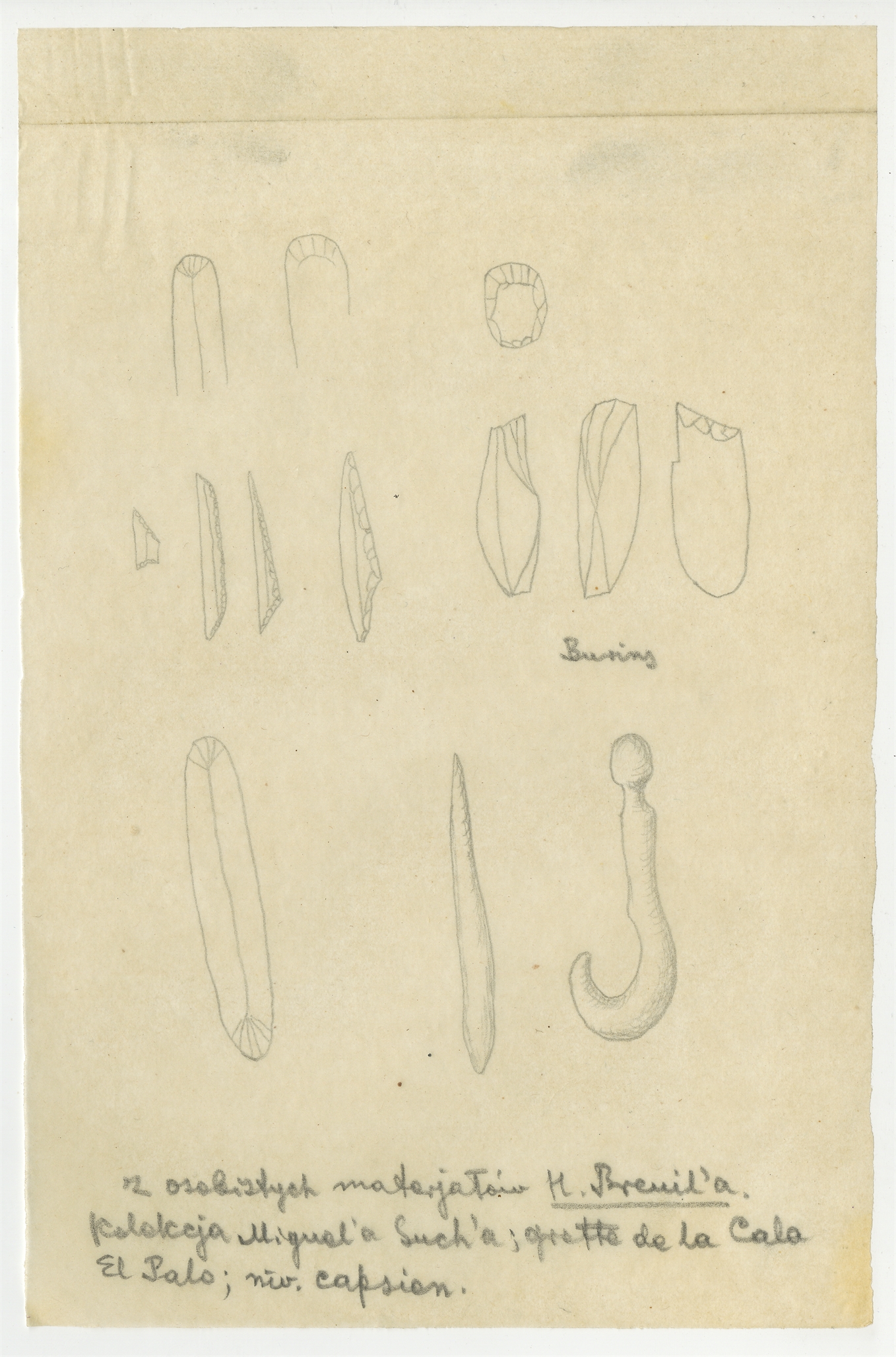 Rysunki - kopie zabytków kościanych i krzemiennych z publikacji Miguela Such'a "Hayo de la Mina" - z osobistych materiałów H.Brenil'a