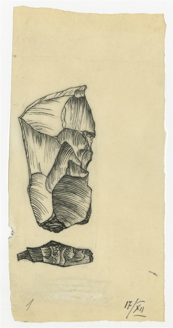 Rysunki wyrobów krzemiennych przem. czerskiego pochodzących ze stanowiska Wyględów wykonane piórkiem i tuszem na kalce technicznej - strona 2: Rysunek narzędzia krzemiennego w dwóch rzutach oznaczony numerem 1 oraz 17/XII