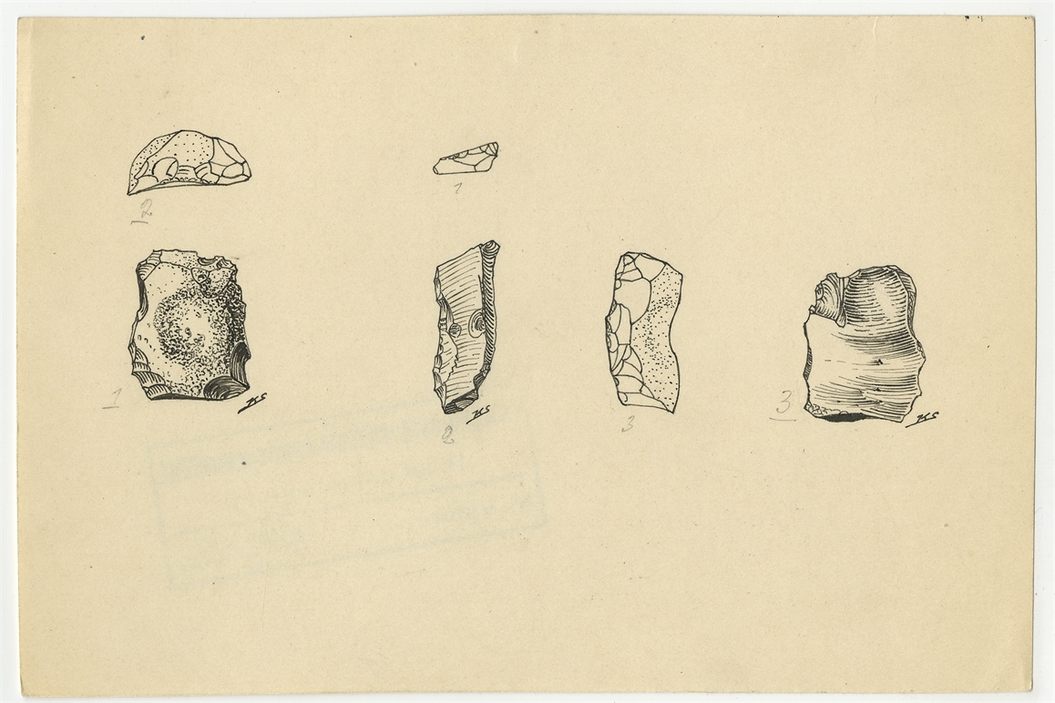 Rysunki zabytków krzemiennych ze stanowiska Gaj. Tusz na kartonie.