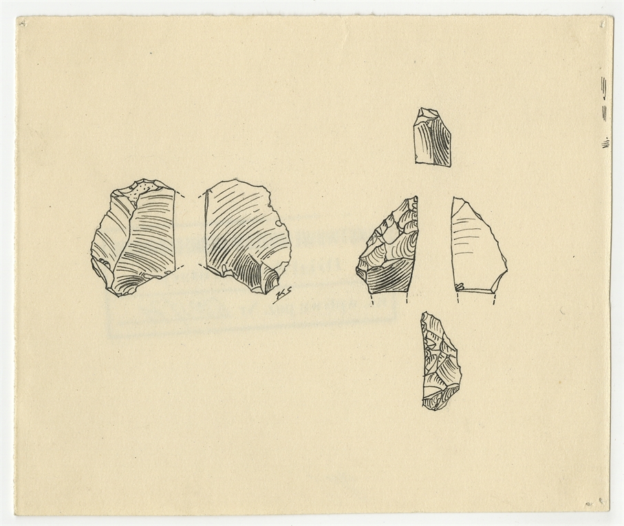 Rysunki zabytków krzemiennych ze stanowiska Gaj. Tusz na kartonie.