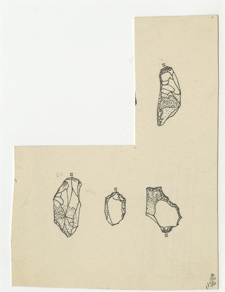 Rysunki zabytków krzemiennych ze stanowiska Gaj. Tusz na kartonie. Kartka uszkodzona - wycięty fragment