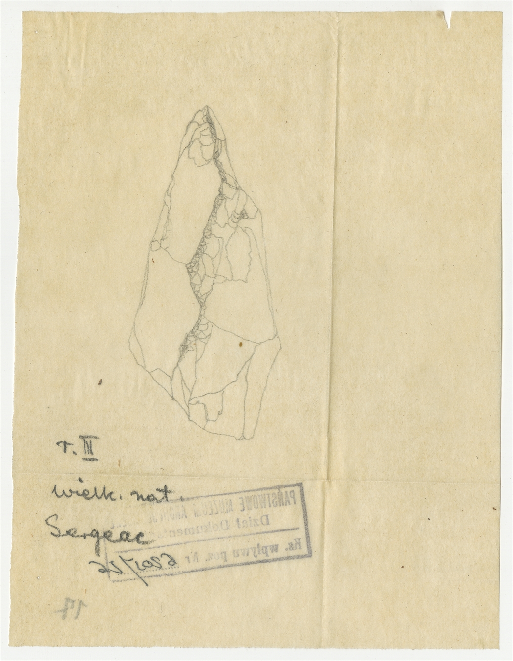 Rysunki zabytku krzemiennego w ołówku - "wiertnik kałkowaty" z Sergeac. Rysunek II