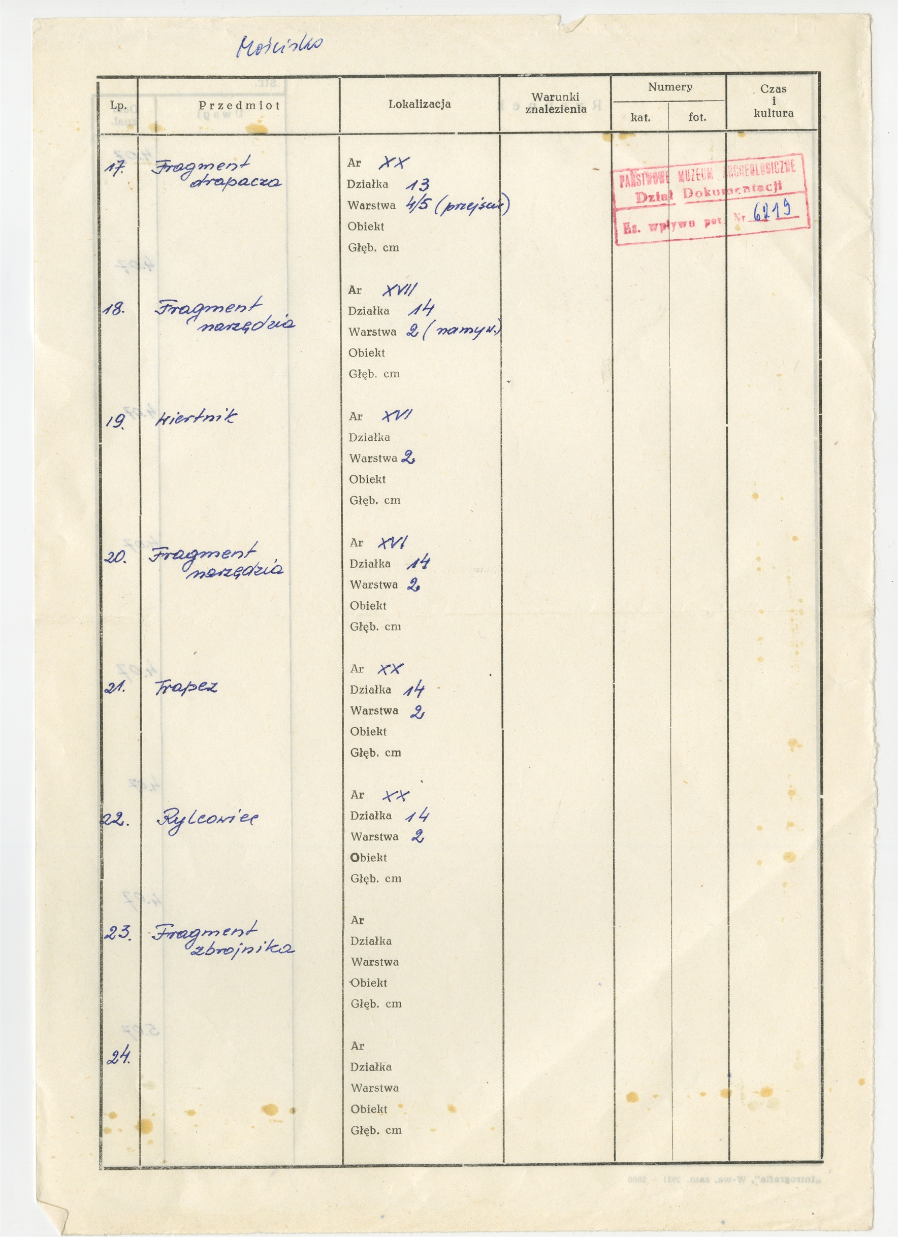 Strona z inwentarza zabytków Mościsko Lp. 17 - 24 daty znalezienia : 4.07 - 5.07 - strona z rubrykami Przedmiot Lokalizacja Warunki znalezienia…