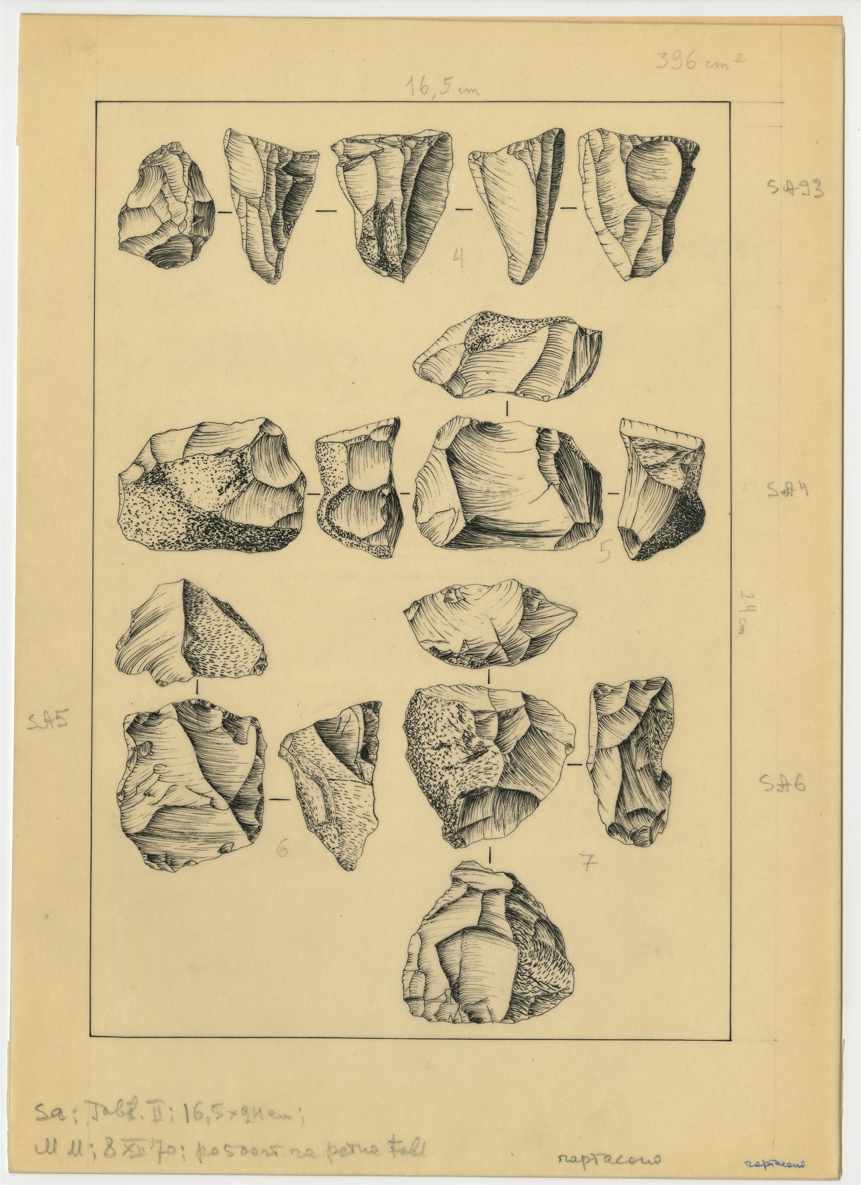 Tablica II z rysunkami zabytków krzemiennych ze stanowiska Sakazyja. Tusz na kalce.