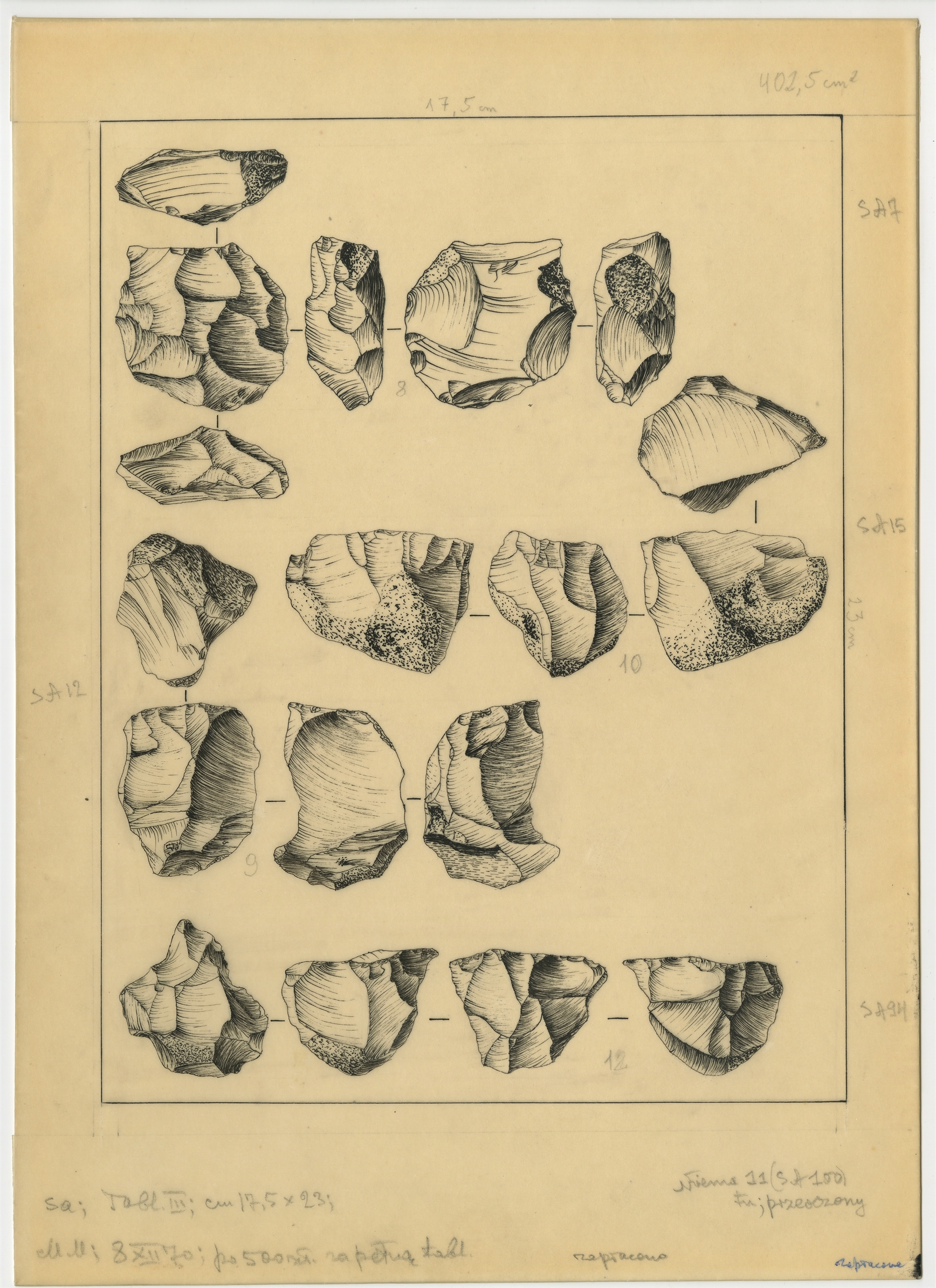 Tablica III z rysunkami zabytków krzemiennych ze stanowiska Sakazyja. Tusz na kalce.