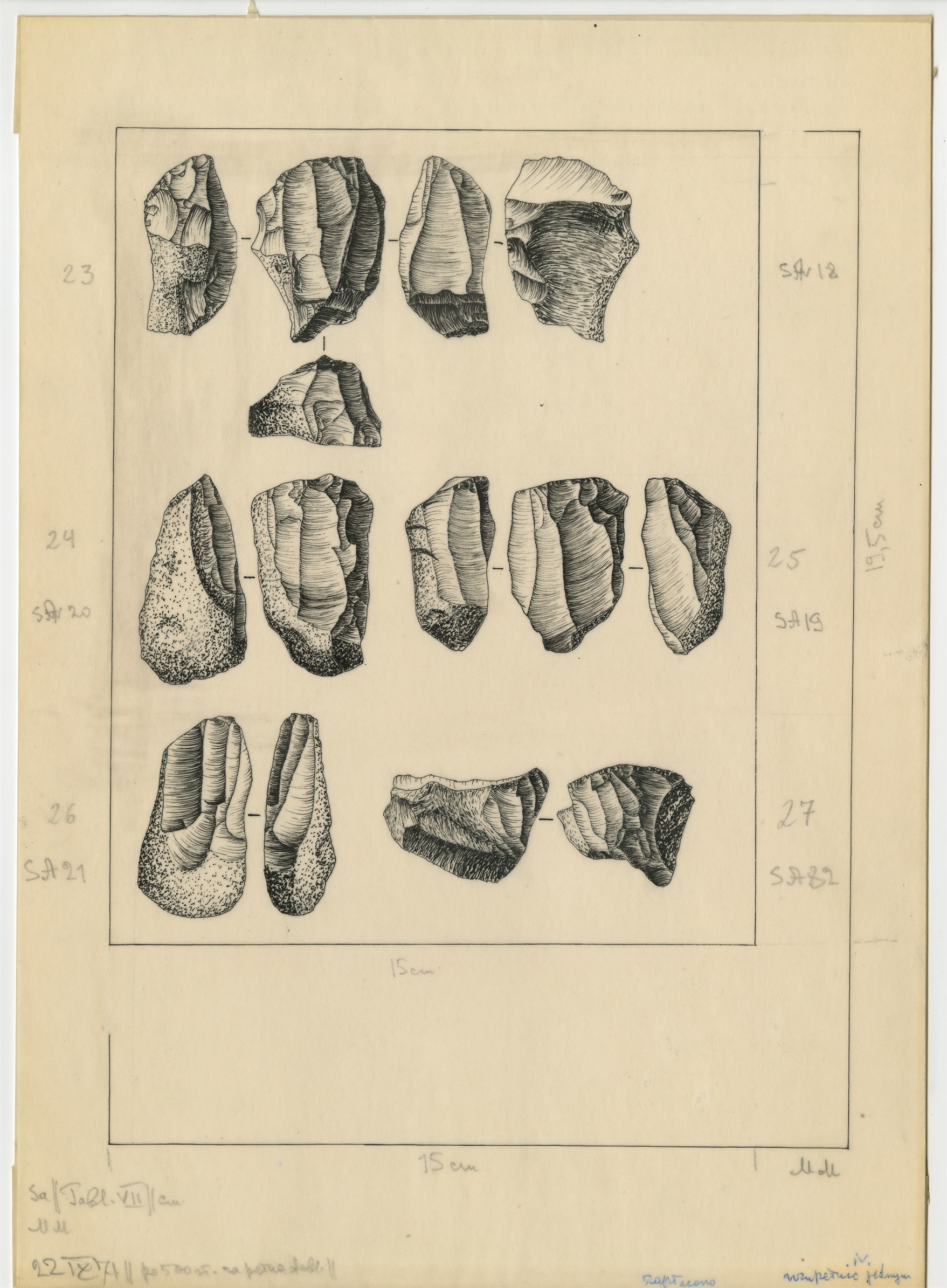 Tablica VII z rysunkami zabytków krzemiennych ze stanowiska Sakazyja. Tusz na kalce.