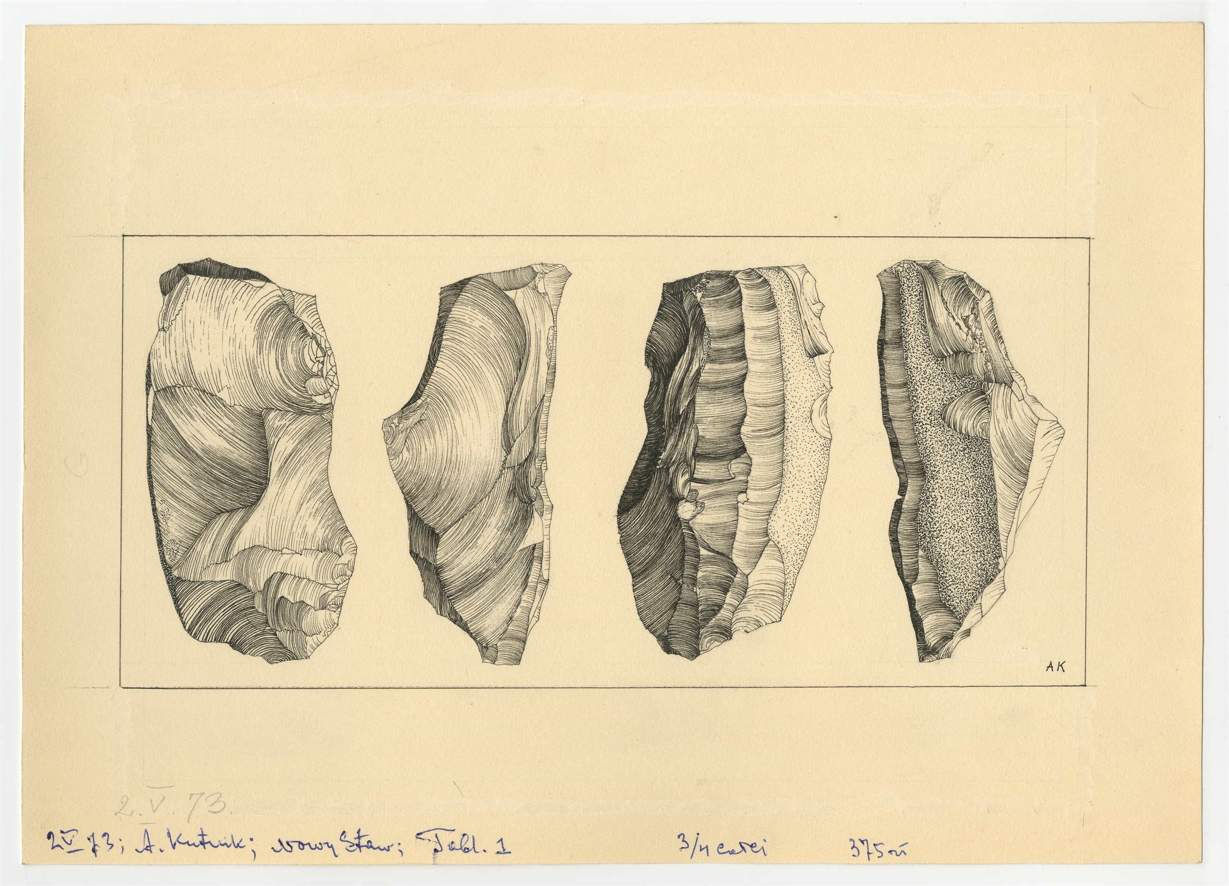 Tablica z 4 rysunkami zabytków krzemiennych (tusz na kartonie) autorstwa A. Kutnik: stanowisko Nowy Staw Tablica 1 (2 V [19]73 roku)