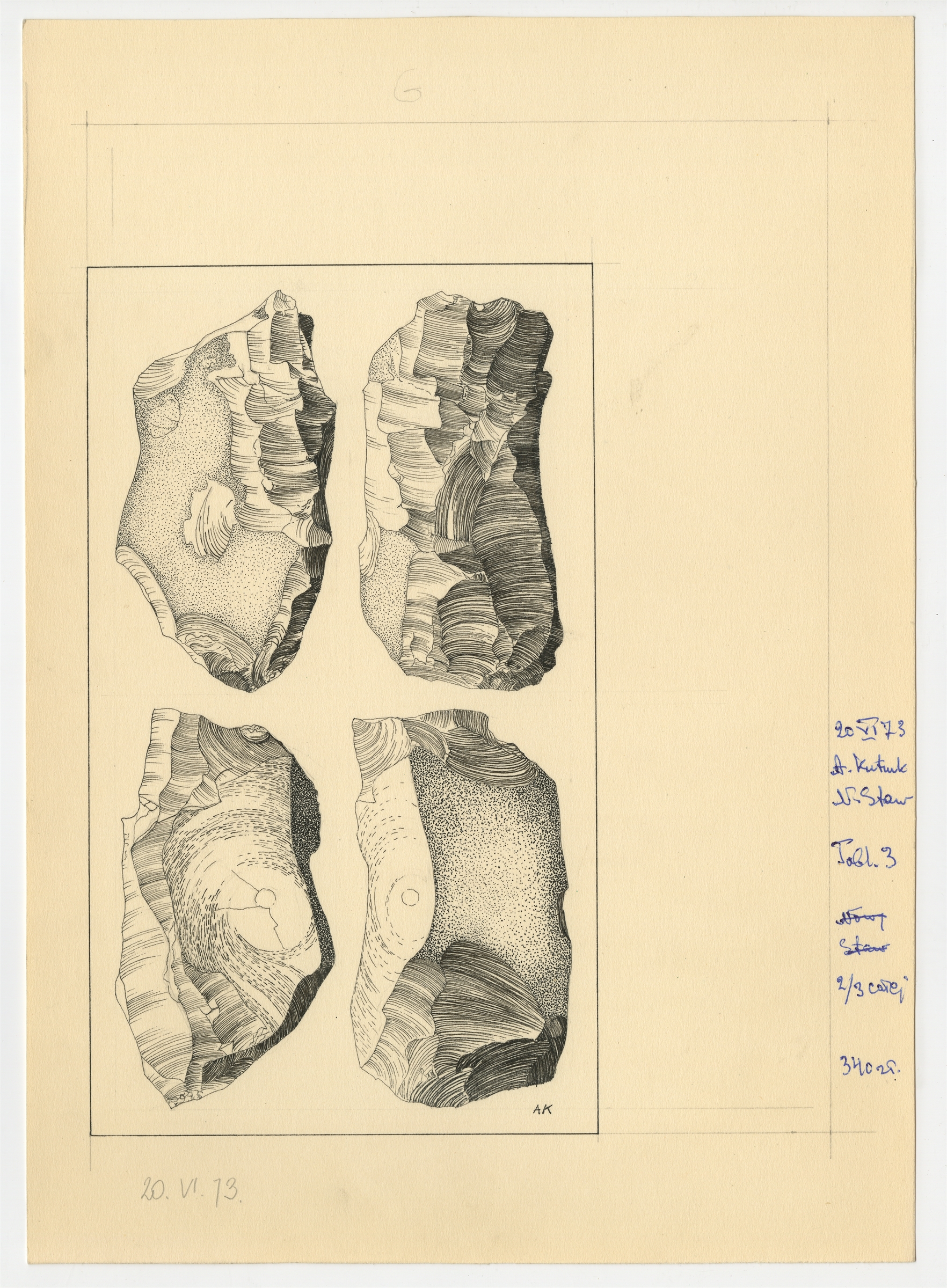 Tablica z 4 rysunkami zabytków krzemiennych (tusz na kartonie) autorstwa A. Kutnik: stanowisko Nowy Staw Tablica 3 (20 VI [19]73 roku)