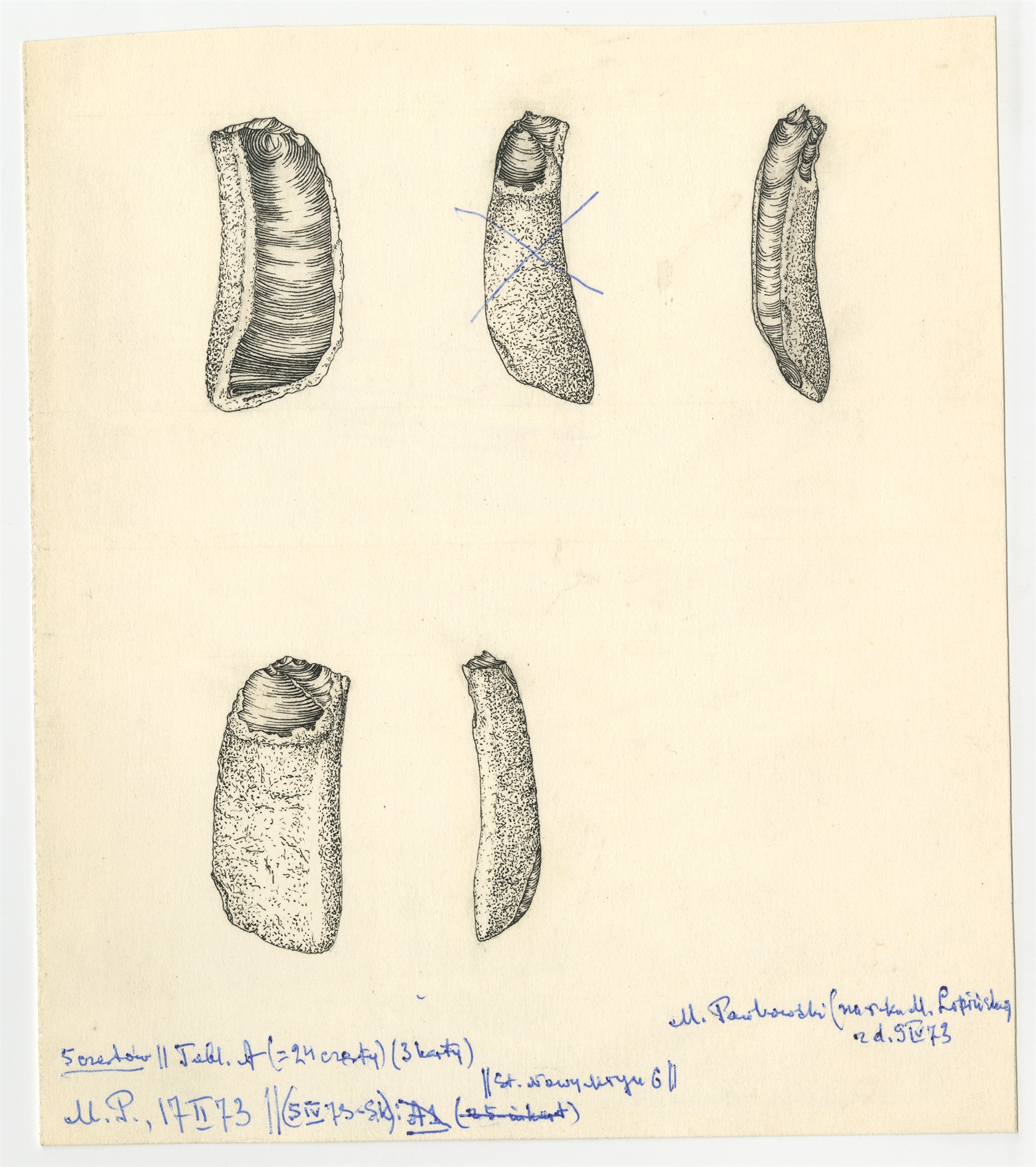 Tablica z 5 rysunkami zabytków krzemiennych (tusz na kartonie) autorstwa Mieczysława Pańkowskiego: stanowisko Nowy Młyn 6 (17 II [19]73 rok)