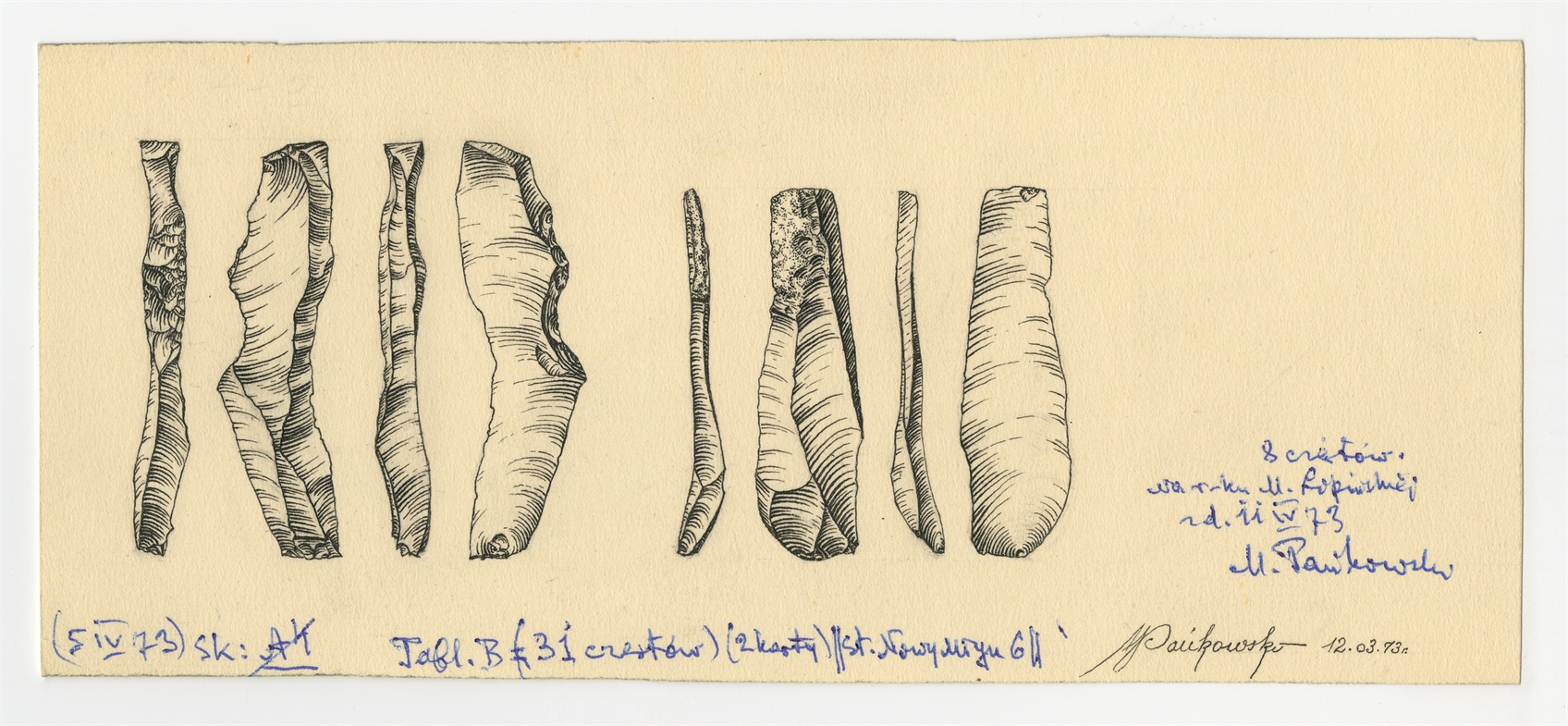 Tablica z 8 rysunkami zabytków krzemiennych (tusz na kartonie) autorstwa Mieczysława Pańkowskiego: stanowisko Nowy Młyn 6 (12.03.[19]73 rok)