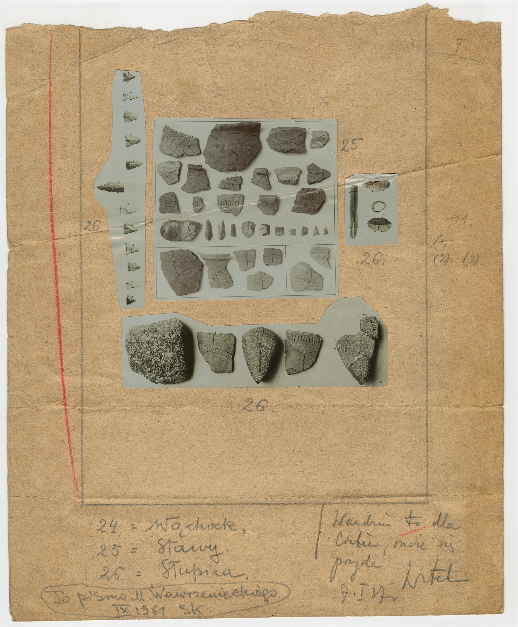 Tablica z fotografiami czarnobiałymi - materiał zabytkowy (krzemienie i ceramika) ze stanowisk w Wąchocku Stawach i Słupicy. Fotografie na kartonie