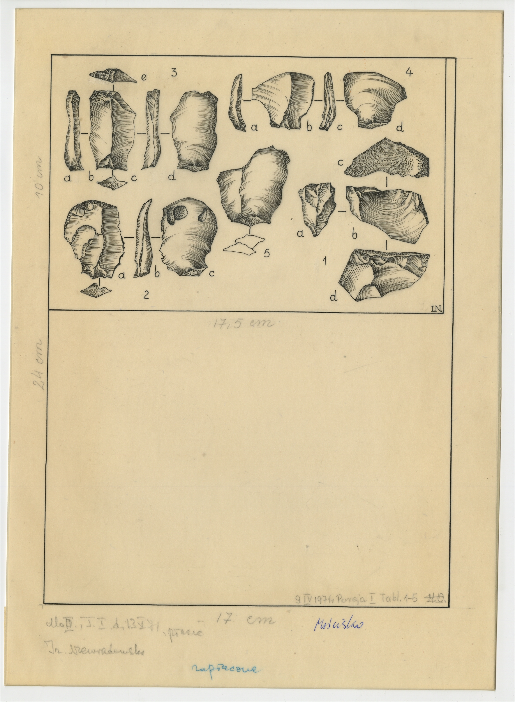 Tablica z rysunkami krzemieni Mościsko tusz na kalce "9 IV 1971 r. Poreja I Tabl. 1-5"
