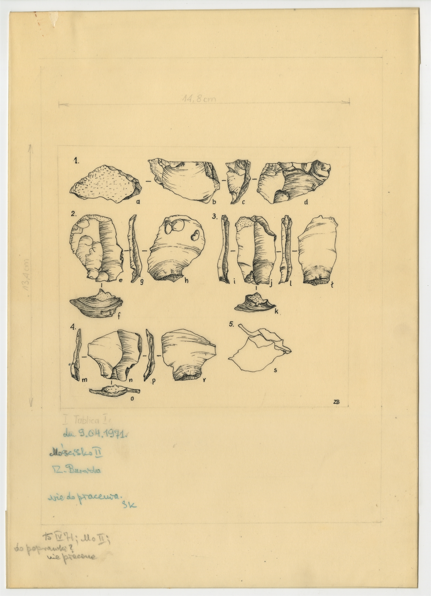 Tablica z rysunkami zabytków krzemiennych. "Tablica I dn. 9.04.1971. Mościsko II Z. Burcicka". Tusz na kalce