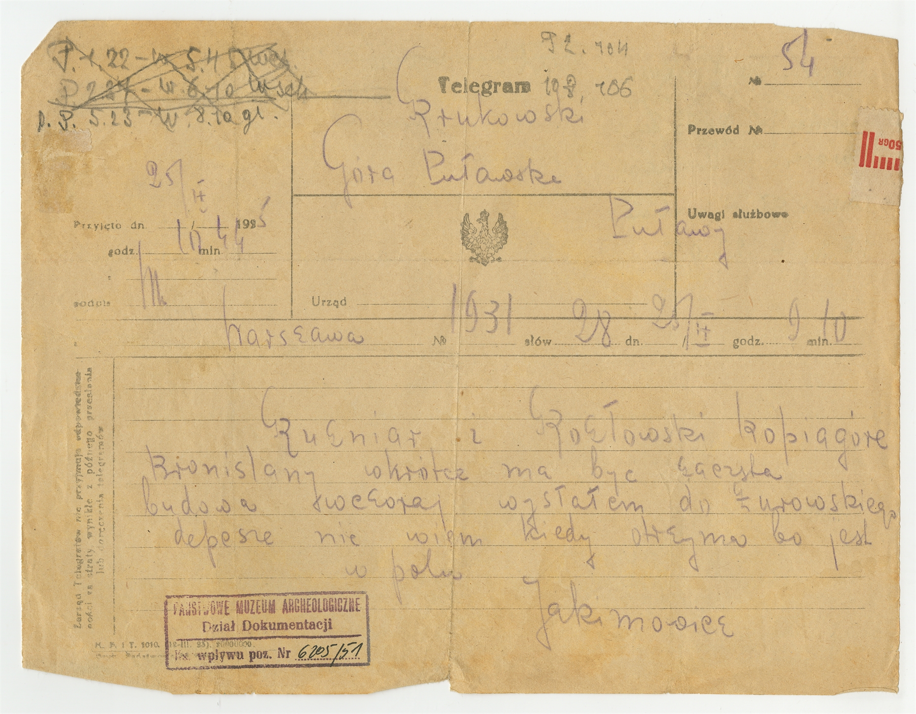 Telegram od Romana Jakimowicza do Stefana Krukowskiego dotyczący Góry Bronisławy