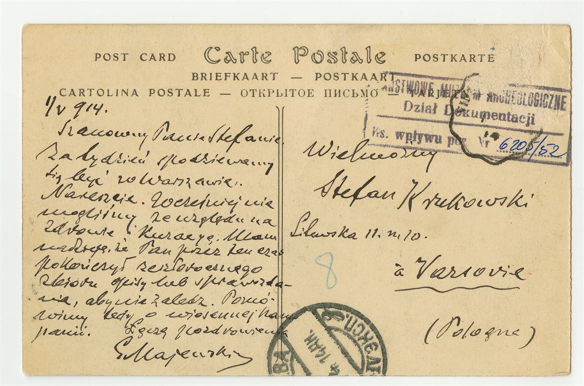 Widokówka od Erazma Majewskiego do Stefana Krukowskiego z dnia 1 V [1]914 roku - awers