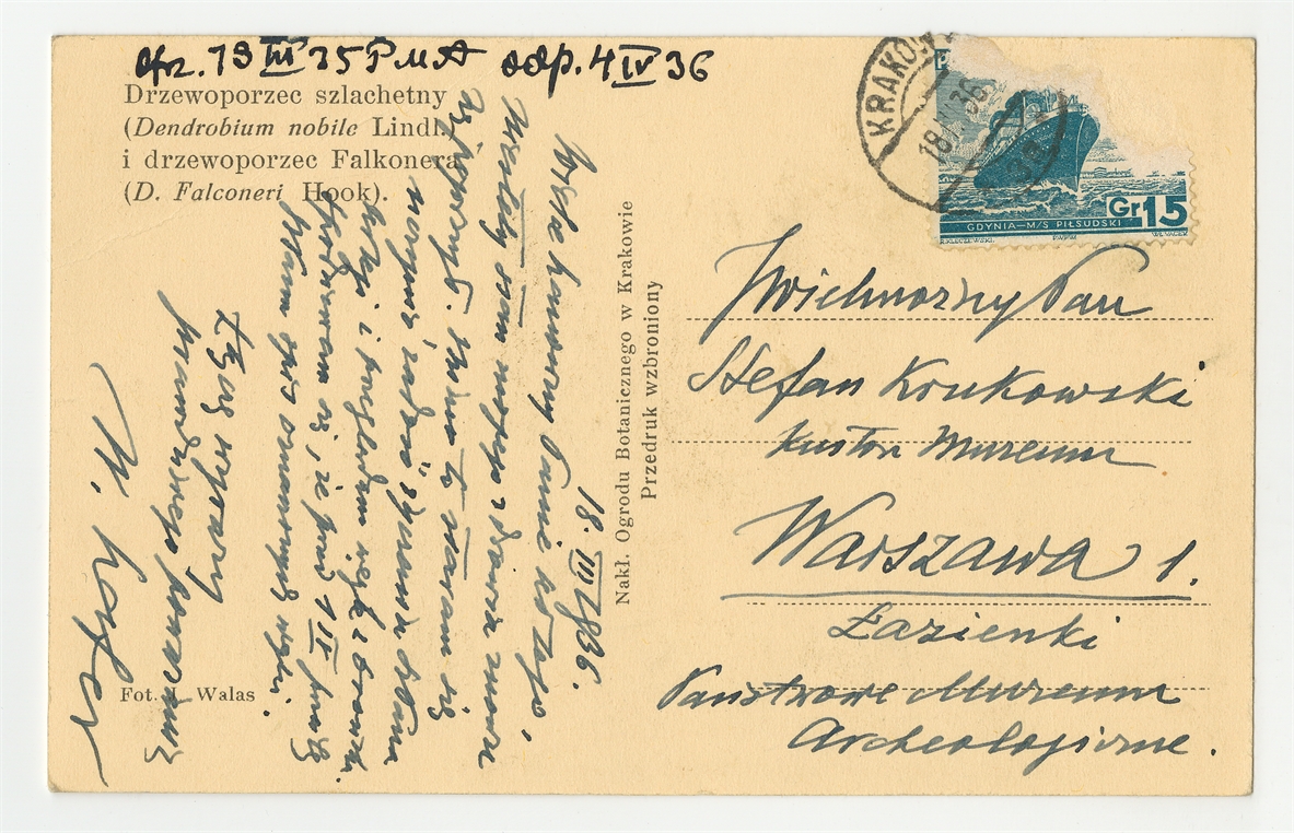 Widokówka od Władysława Szafera do Stefana Krukowskiego z dnia 18 III [19]36 roku - awers