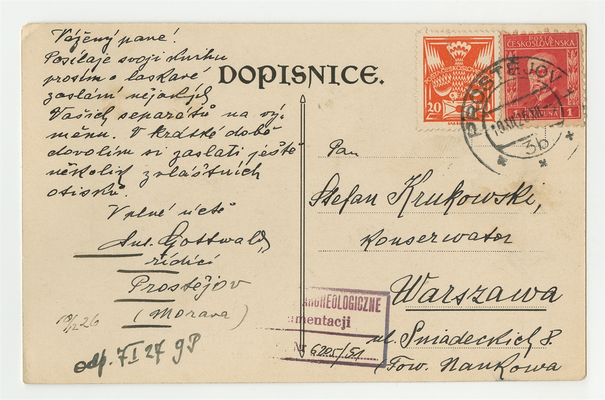 Widokówka w języku czeskim od A Gottwalda do Stefana Krukowskiego z dnia 10.12.[19]26 roku - awers