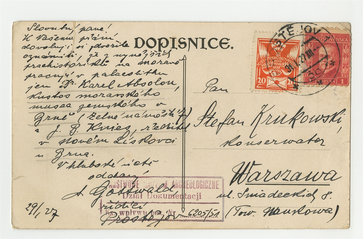 Widokówka w jezyku czeskim od A Gottwalda do Stefana Krukowskiego z dnia 29 I [19]27 roku -awers