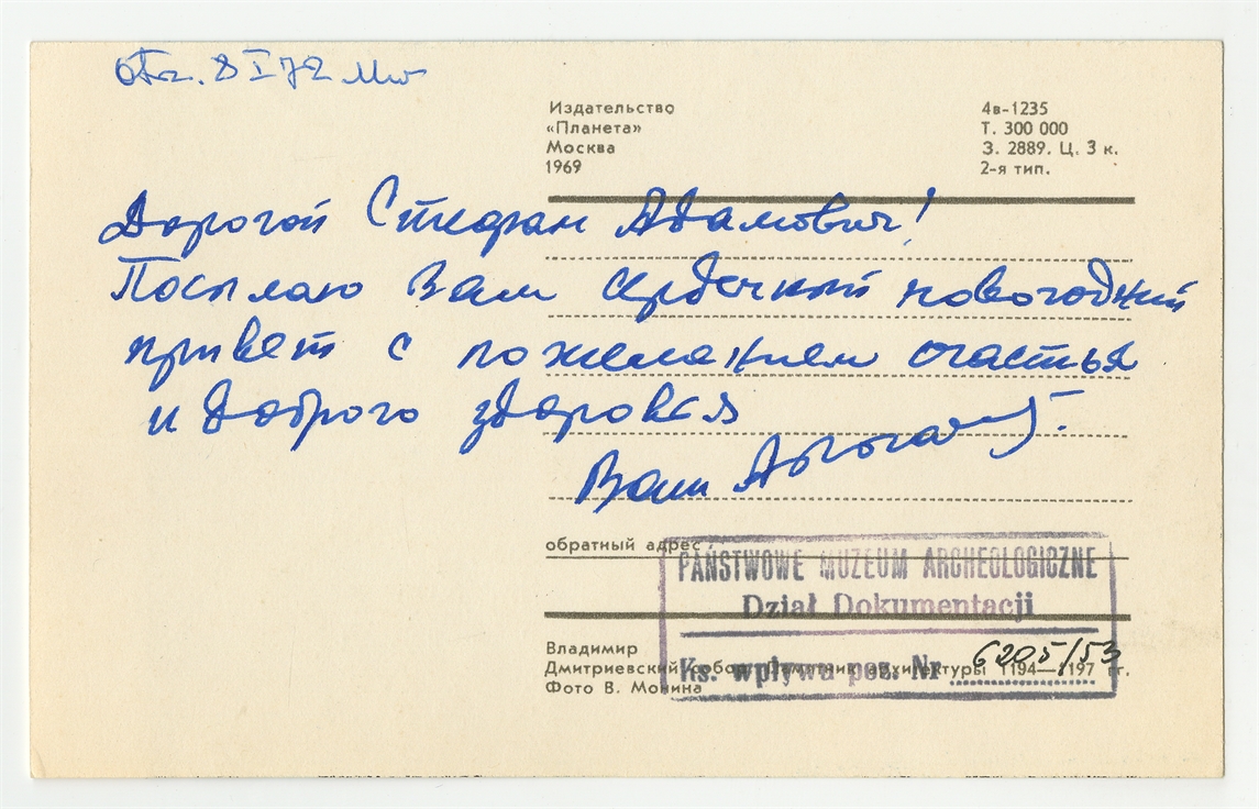 Widokówka w języku rosyjskim od A.N. Rogaczewa do Stefana Krukowskiego z przełomu roku 1971/1972 - awers