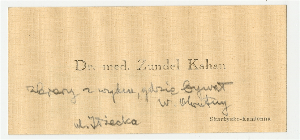Wizytówka dr. med. Zundel Kahan. Ręką S. Krukowskiego notatka związana z właścicielem