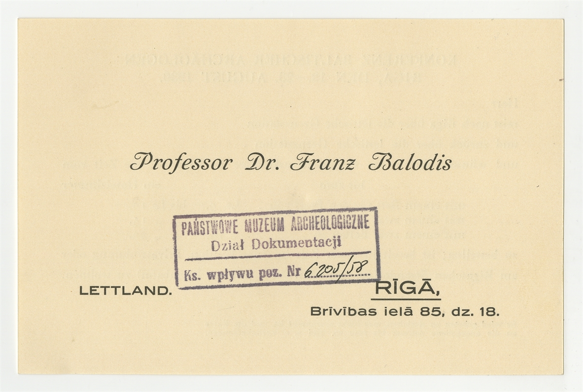 Wizytówka po jednej stronie nazwisko prof. Dr. Franz'a Balodis po drugiej stronie informacje do wypełnienia "Herr…"