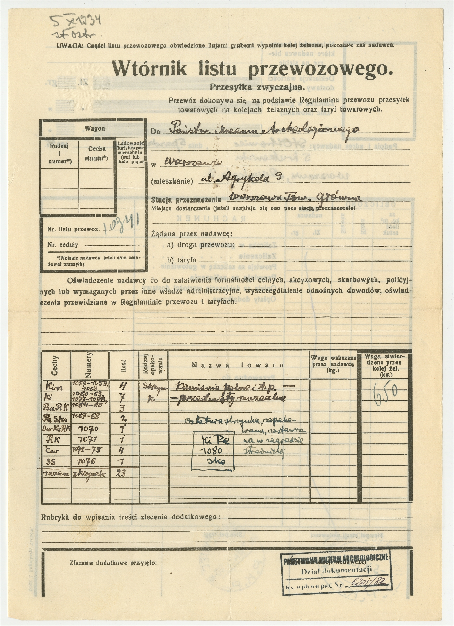 Wtórnik listu przewozowego nr 10341 z dnia 5 października 1934 roku na przesyłkę z przedmiotami muzealnymi ze stacji Ostrowiec do Warszawy -strona 1
