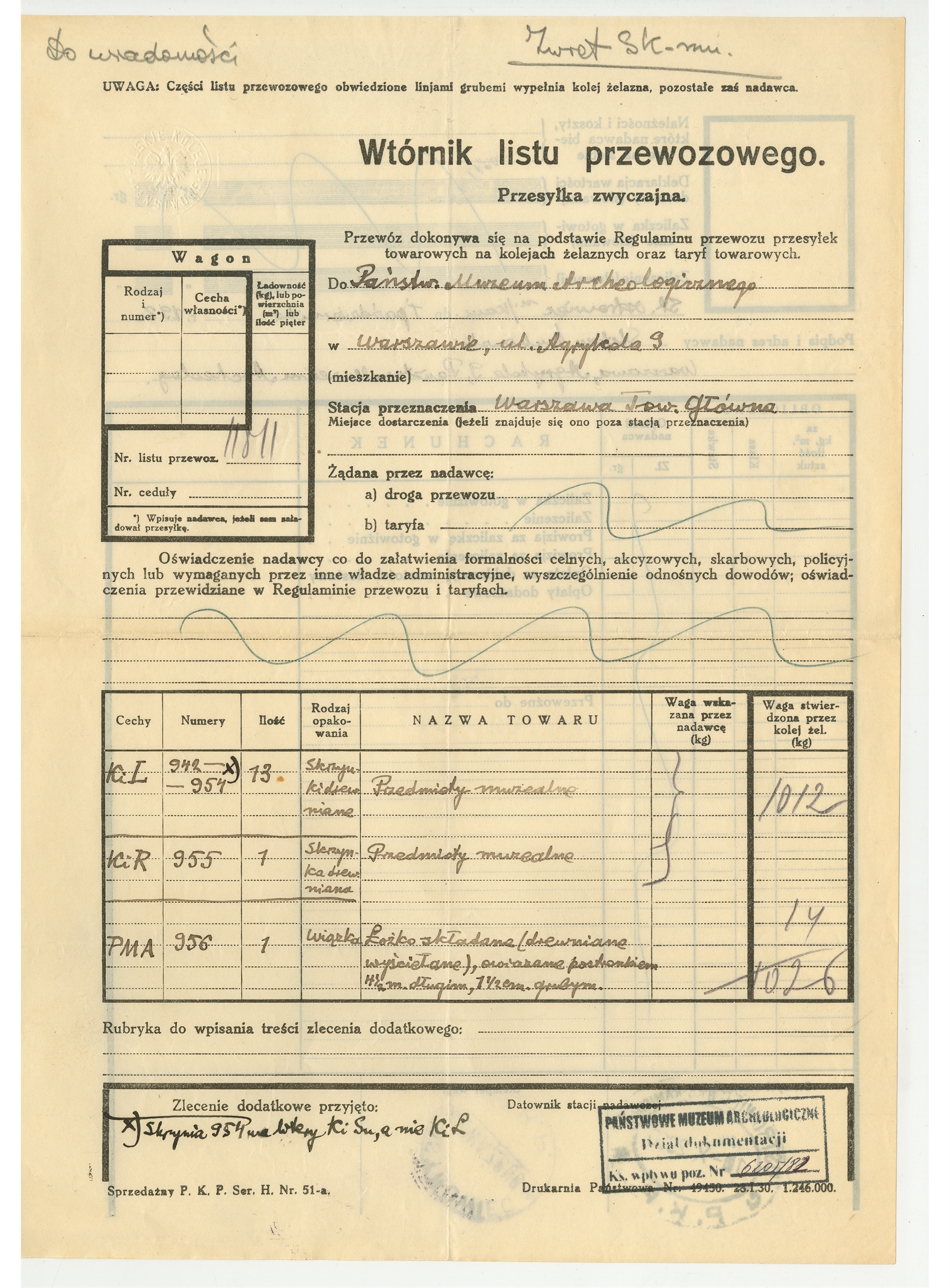 Wtórnik listu przewozowego nr 11811 z dnia 1 października 1930 roku na przesyłkę z przedmiotami muzealnymi ze stacji Ostrowiec do Warszawy - strona 1