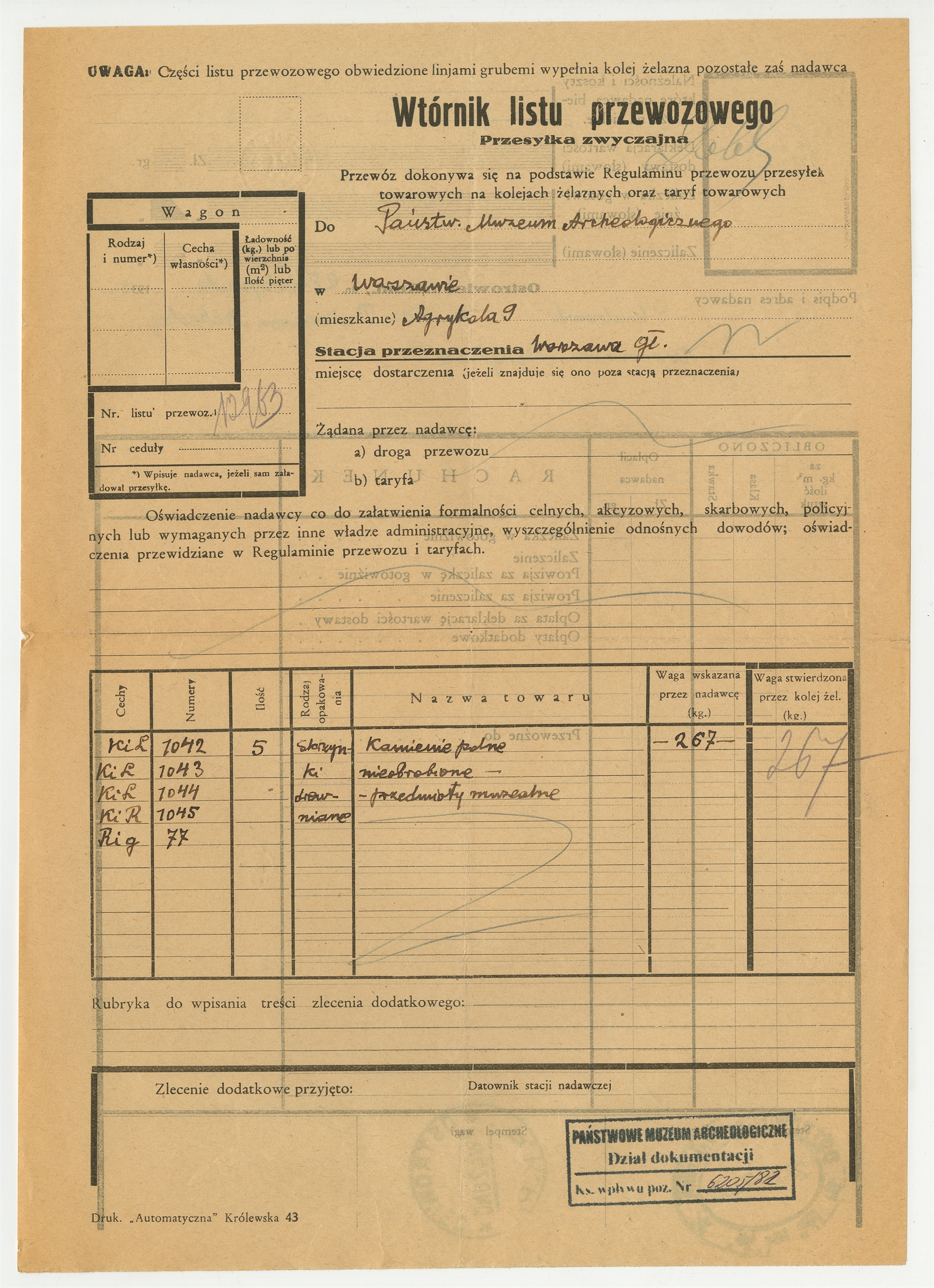 Wtórnik listu przewozowego nr 12963 z dnia 28 listopada 1933 roku na przesyłkę z przedmiotami muzealnymi ze stacji Ostrowiec do Warszawy - strona 1