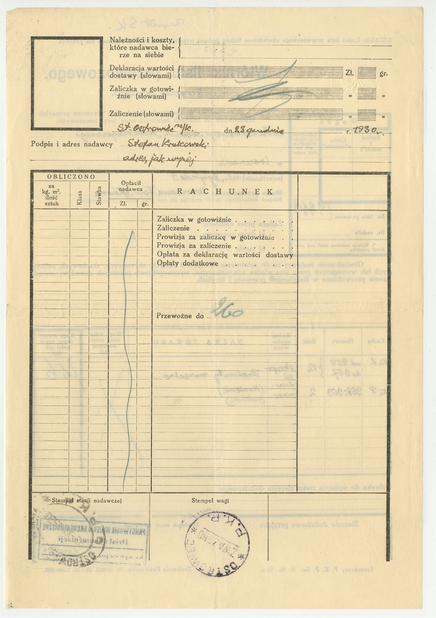 Wtórnik listu przewozowego nr 14889 z dnia 23 grudnia 1930 roku na przesyłkę z przedmiotami muzealnymi ze stacji Ostrowiec do Warszawy - strona 2