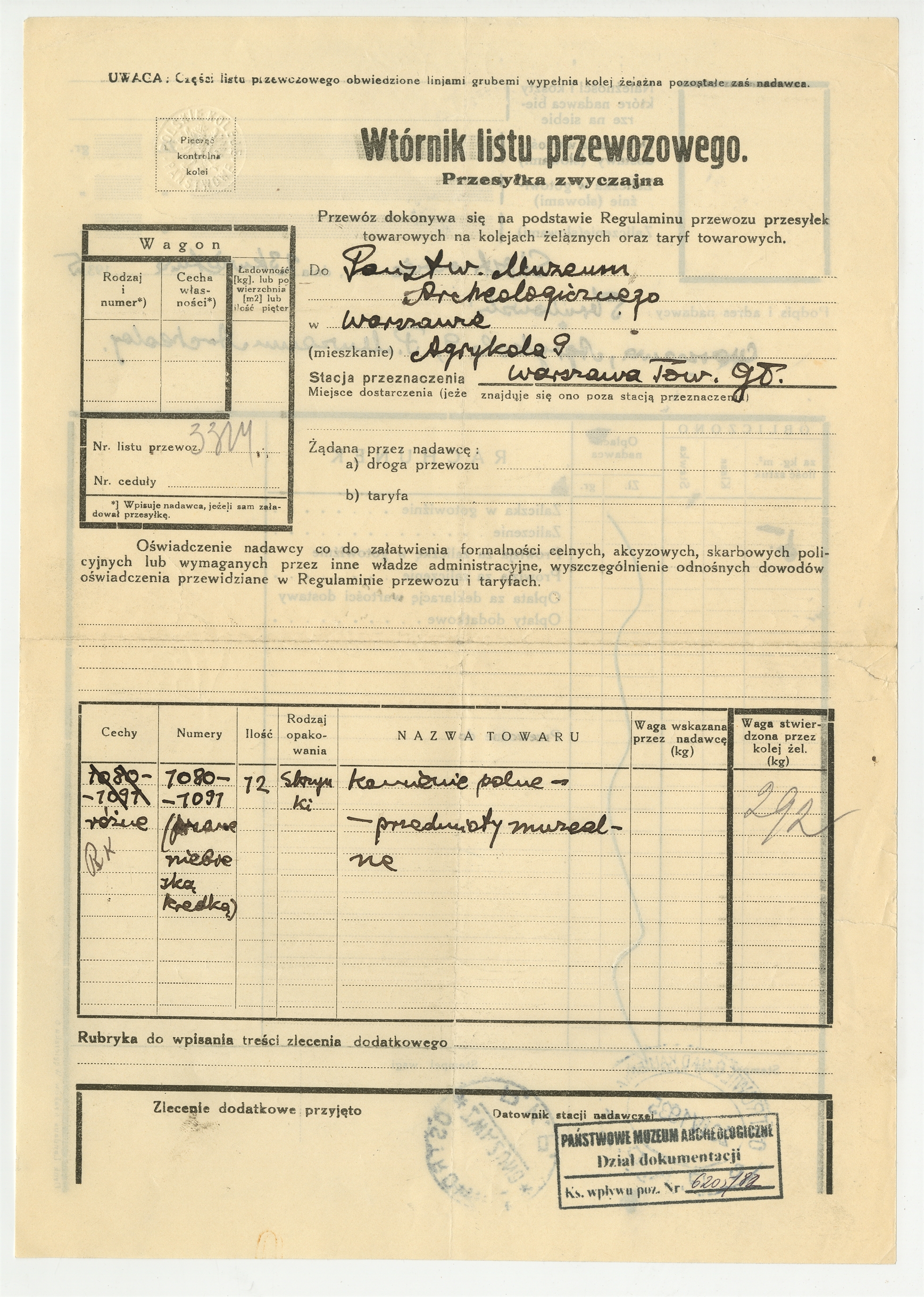Wtórnik listu przewozowego nr 3314 z dnia 23 kwietnia 1935 roku na przesyłkę z przedmiotami muzealnymi ze stacji Ostrowiec do Warszawy - strona 1