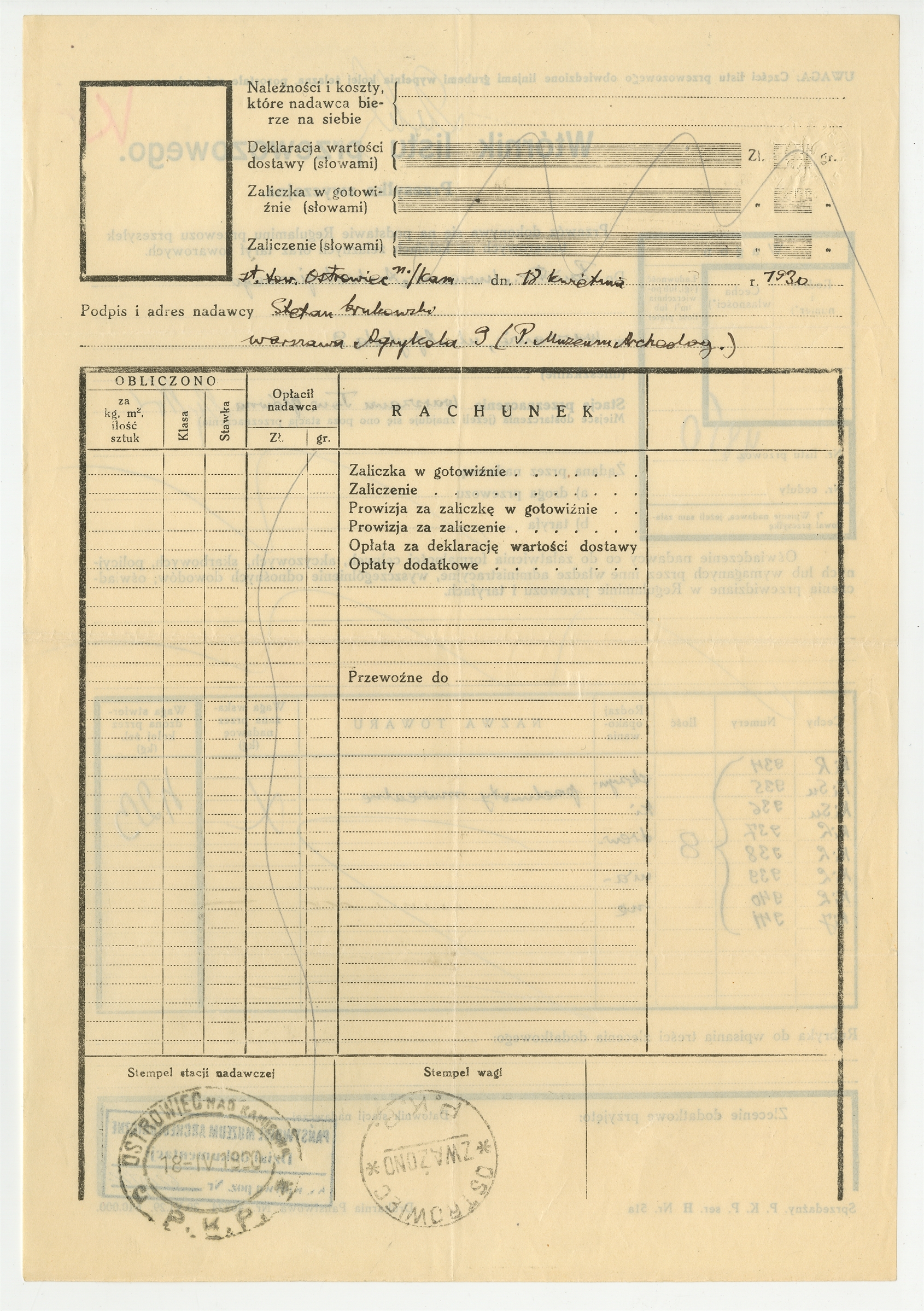 Wtórnik listu przewozowego nr 4850 z dnia 18 kwietnia 1930 roku na przesyłkę z przedmiotami muzealnymi ze stacji Ostrowiec do Warszawy - strona 2