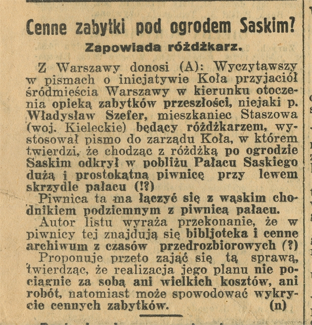 Wycinek prasowy: Cenne zabytki pod ogrodem Saskim? Zapowiada różdżkarz "Ilustrowany Kuryer Codzienny. Życie Warszawy" nr 329 niedziela 27 listopada 1932 s. nieokreślona - strona 1: "Z Warszawy donosi (A): Wyczytawszy w pismach o inicjatywie (...)"