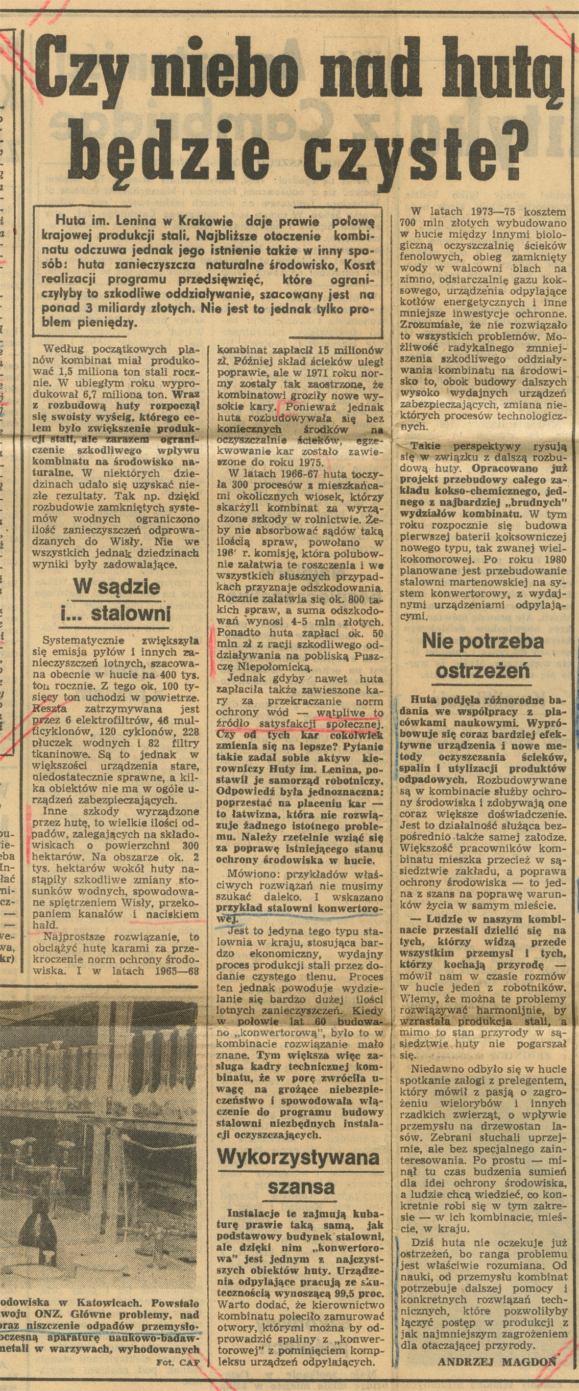 Wycinek prasowy: Czy niebo nad hutą będzie czyste? "Trybuna Ludu" nr 225 poniedziałek 29 września 1975r. s. 5 - strona 1: "Huta im. Lenina w Krakowie daje prawie połowę krajowej produkcji stali (…)"