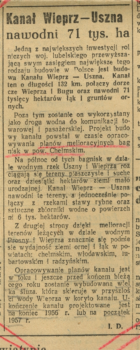 Wycinek prasowy: Kanał Wieprz-Uszna nawodni 71 tys. ha "Słowo Powszechne" nr 30 (2322) sobota-niedziela 6-7 lutego 1955 r. s. 9- strona 1: "Jedną z największych inwestycji rolniczych woj. lubelskiego (…)