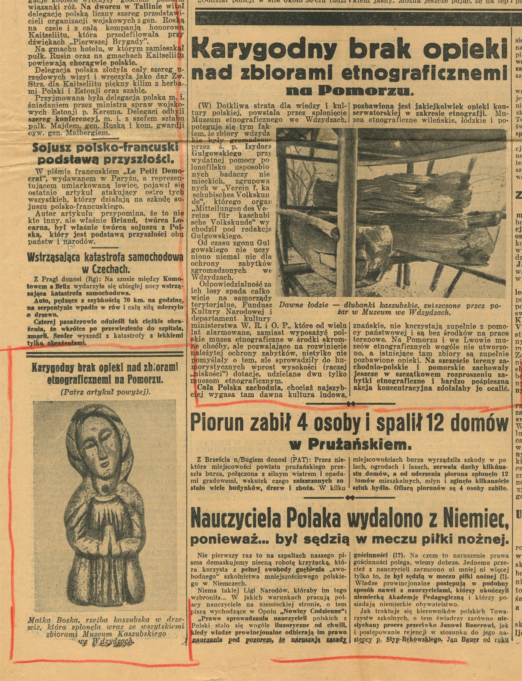 Wycinek prasowy: Karygodny brak opieki nad zbiorami etnograficznemi na Pomorzu "Ilustrowany Kuryer Codzienny" nr 179 czwartek 30 czerwca 1932 r. s. 7- strona 1: "Dotkliwa strata dla wiedzy i kultury polskiej (…)"