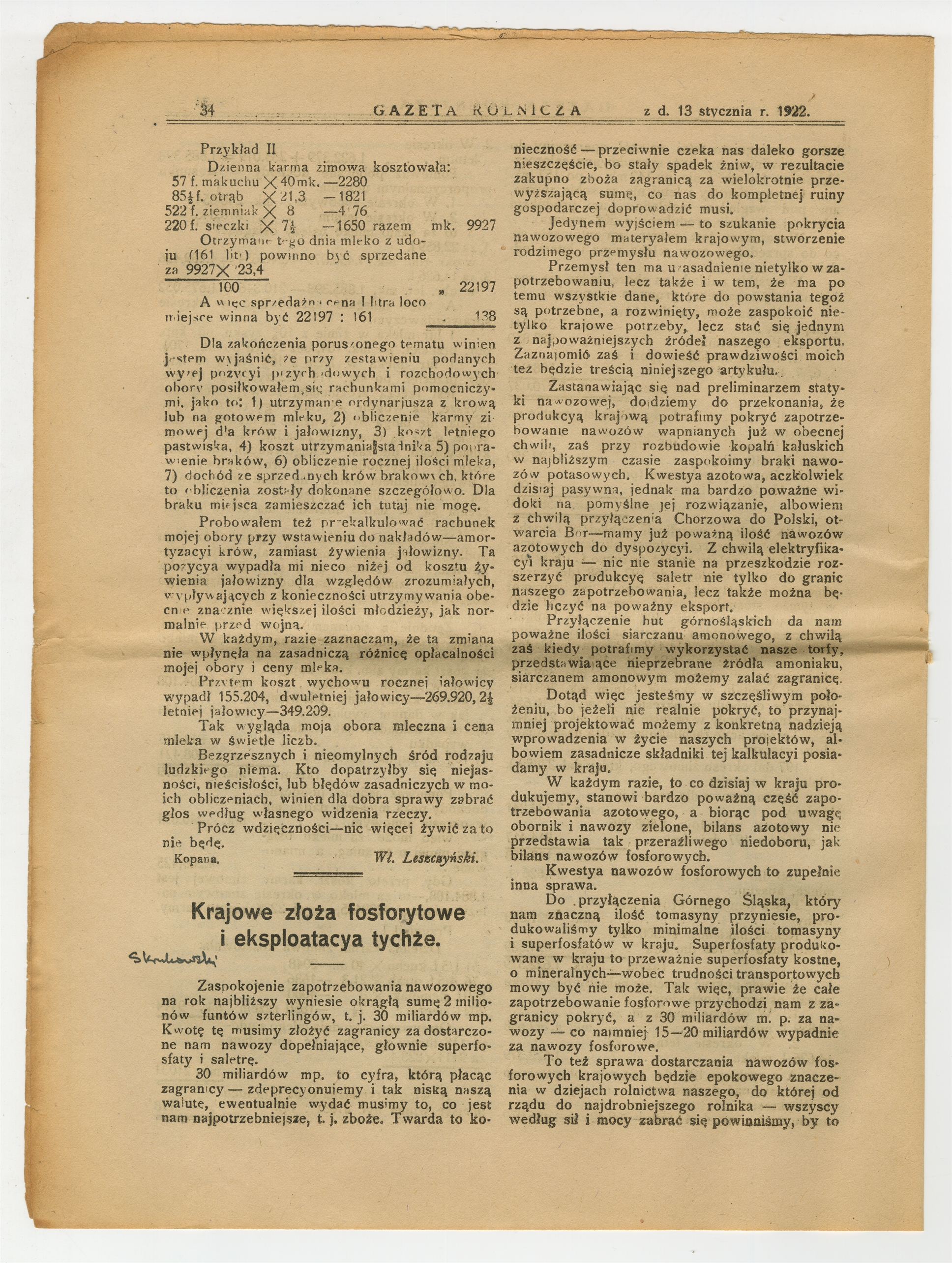 Wycinek prasowy: Krajowe złoża fosforytowe i eksploatacya tychże "Gazeta rolnicza" Rok LXII nr 2 13 stycznia 1922 r. s. 34-37- strona 1: "Zaspokojenie zapotrzebowania nawozowego na rok najbliższy (…)"