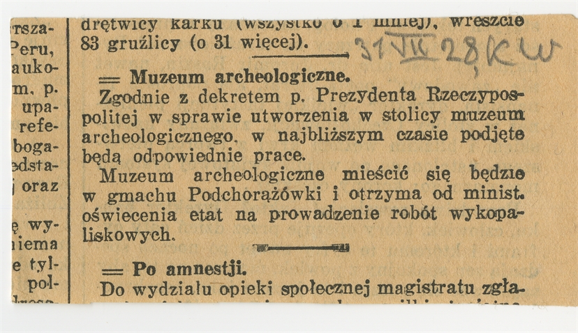 Wycinek prasowy: Muzeum Archeologiczne "Kurier Warszwski" 31 lipca 1928- strona 1: "Zgodnie z dekretem p. Prezydenta Rzeczypospolitej w sprawie utworzenia w stolicy muzeum archeologicznego (…)"