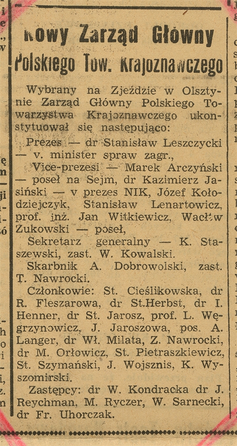 Wycinek prasowy: Nowy Zarząd Główny Polskiego Tow. Krajoznawczego "Kurier Codzienny" nr 168 (1372) Rrok V 22 czerwca 1949 r. s. 6 - strona 1: "Wybrany na Zjeździe w Olsztynie Zarząd Główny (…)"