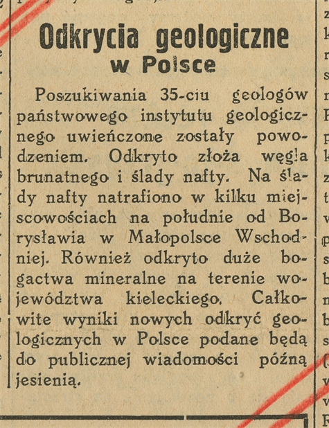 Wycinek prasowy: Odkrycia geologiczne w Polsce "Wieczór Warszawski" nr 266 s. 4- strona 1: Poszukiwania 35-ciu geologów państwowego instytutu geologicznego (…)"